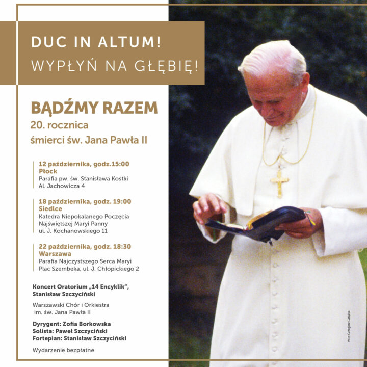 "Duc in Altum” to kontynuacja wydarzeń koncertowych i edukacyjnych, organizowanych w br. z okazji 20. rocznicy śmierci Jana Pawła II. Projekt został zainicjowany przez członków Warszawskiego Chóru im. św. Jana Pawła II, działającego przy Archikatedrze Warszawskiej. Współorganizatorem wydarzeń w Warszawie, Płocku i Siedlcach, zaplanowanych na październik br., został Instytut Papieża Jana Pawła II. Partnerem projektu jest Mt 5,14 | Muzeum Jana Pawła II i Prymasa Wyszyńskiego.