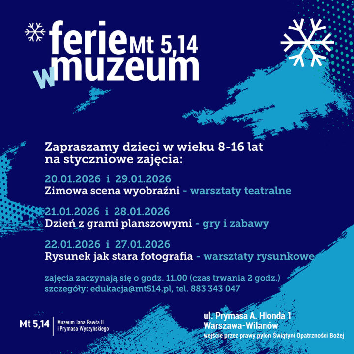 Gry planszowe, warsztaty teatralne i rysunkowe oraz 2000 m2 ekspozycji najwyżej położonego muzeum w Warszawie to tylko niektóre z atrakcji, które w czasie zimowych ferii czekają na odwiedzających Mt 5,14 | Muzeum Jana Pawła II i Prymasa Wyszyńskiego. Serdecznie zapraszamy na „zimową scenę wyobraźni”.