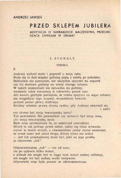 Przed sklepem jubilera to sztuka pełna ciszy, głęboko liryczny, rodzaj dialogu serc i sumień. Tekst wydaje się rodzajem modlitwy, wołaniem o miłość wierną i mądrą. Sztuka dyskretnie zaprasza, by na nowo odkryć, że prawdziwa miłość jest nie tylko uczuciem, ale drogą, przymierzem, ofiarą i łaską. Tak przeżywana, żyje na wieki…