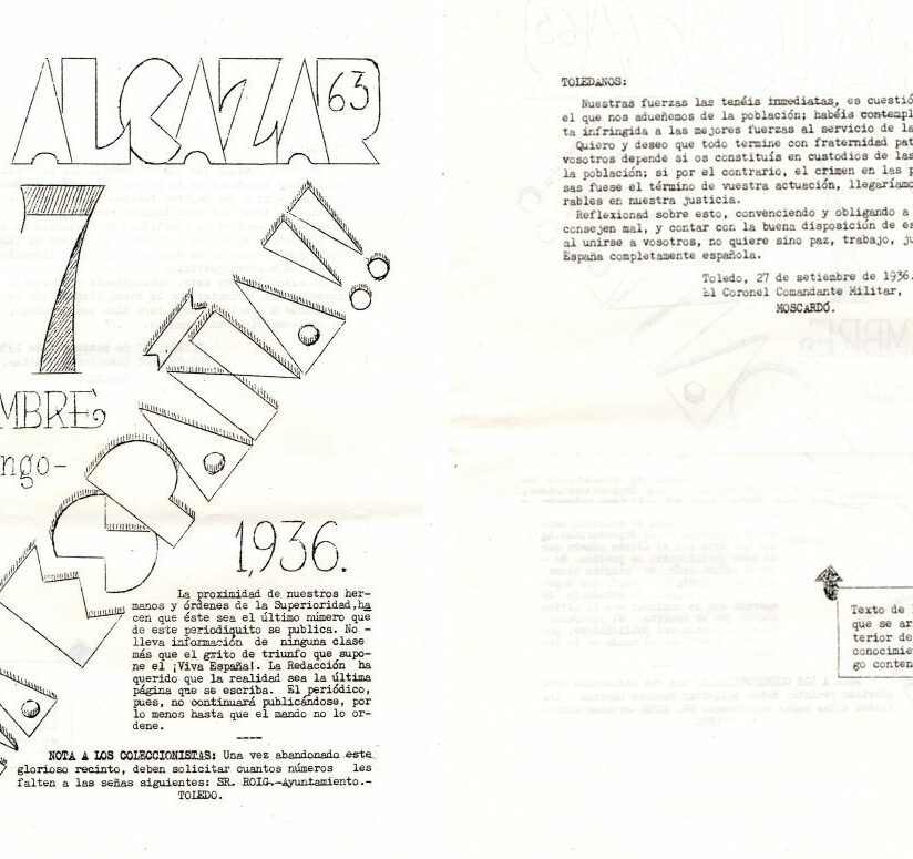 W Toledo przewrót wojskowy raczej się nie udał. Znacznie przeważające liczebnie siły republikańskie zepchnęły rebeliantów dowodzonych przez płk. José Ituarte Moscardó na teren Alkazaru – fortecy górującej nad miastem, stanowiącej siedzibę miejscowej akademii wojskowej. Pułkownik Moscardó zabarykadował się w twierdzy wraz z 1300 ludźmi, wśród których byli wojskowi, członkowie Gwardii Cywilnej, falangiści oraz kadeci, a także ponad pół tysiąca kobiet i dzieci.