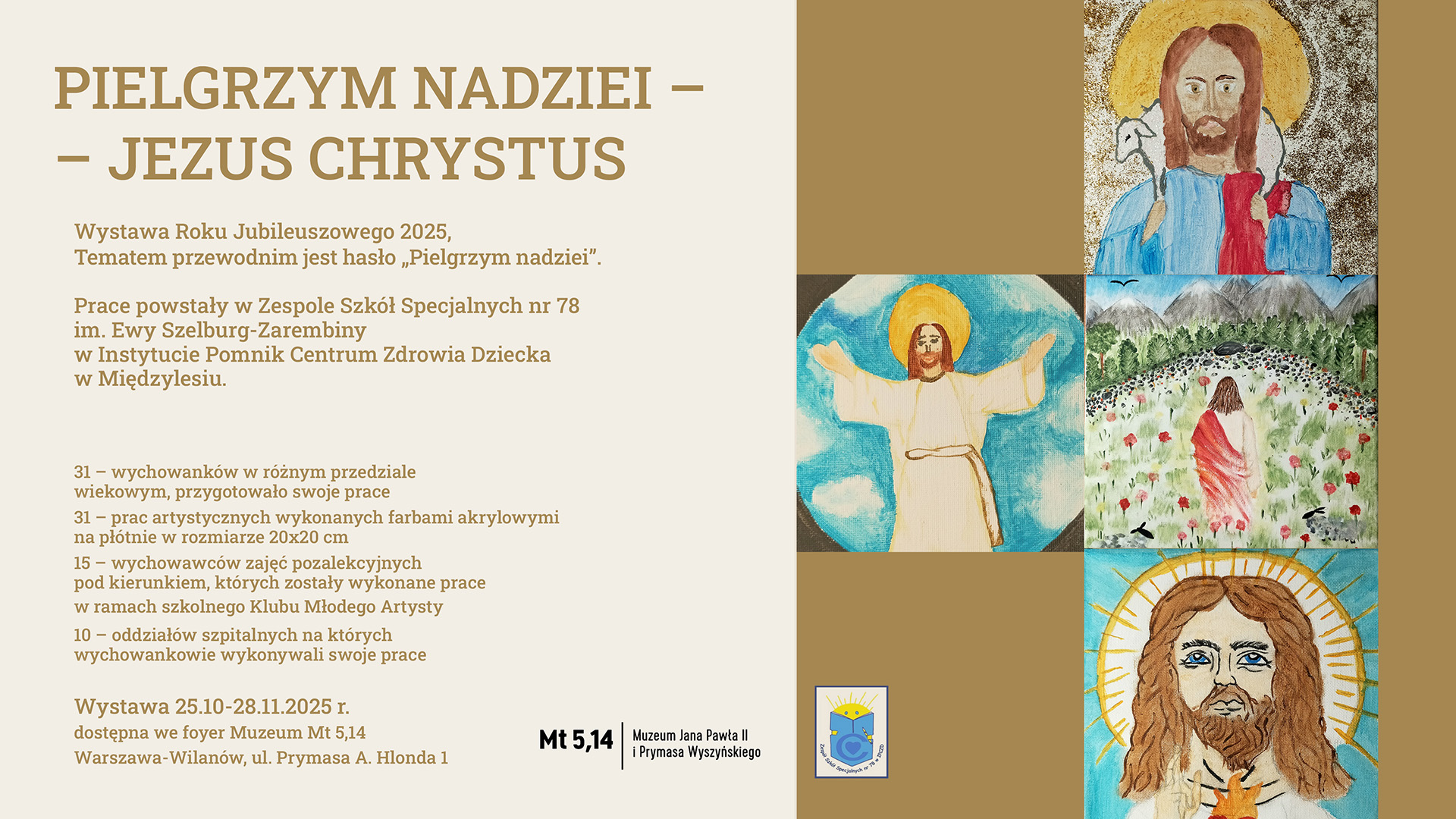 Zapraszamy do Muzeum na prezentację prac dzieci z Zespołu Szkół Specjalnych nr 78 im. Ewy Szelburg-Zarembiny w Międzylesiu. Tematem przewodnim wystawy jest hasło Roku Jubileuszowego: „Pielgrzym Nadziei – Jezus Chrystus”.