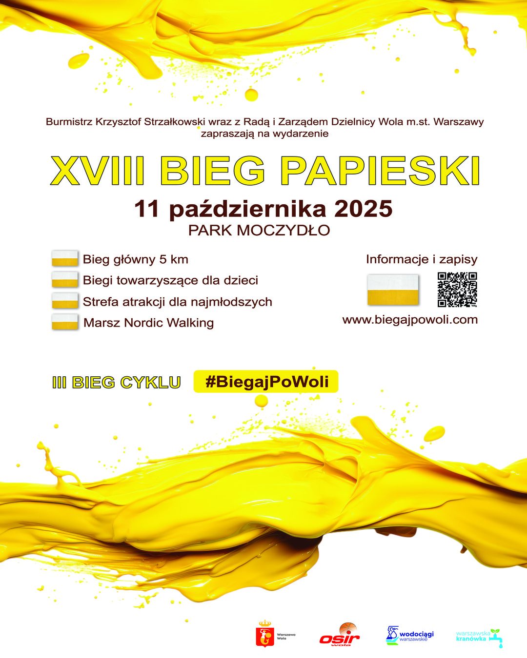Bieg Papieski jest okazją do upamiętnienia rocznicy wyboru Jana Pawła II. Impreza została przygotowana wspólnie przez Urząd Dzielnicy Wola, Sanktuarium św. Józefa Oblubieńca NMP, Miejskie Przedsiębiorstwo Wodociągów i Kanalizacji oraz miejscowy Ośrodek Sportu i Rekreacji. Na uczestników czeka Strefa Zabaw wraz ze stoiskiem Mt 5,14.